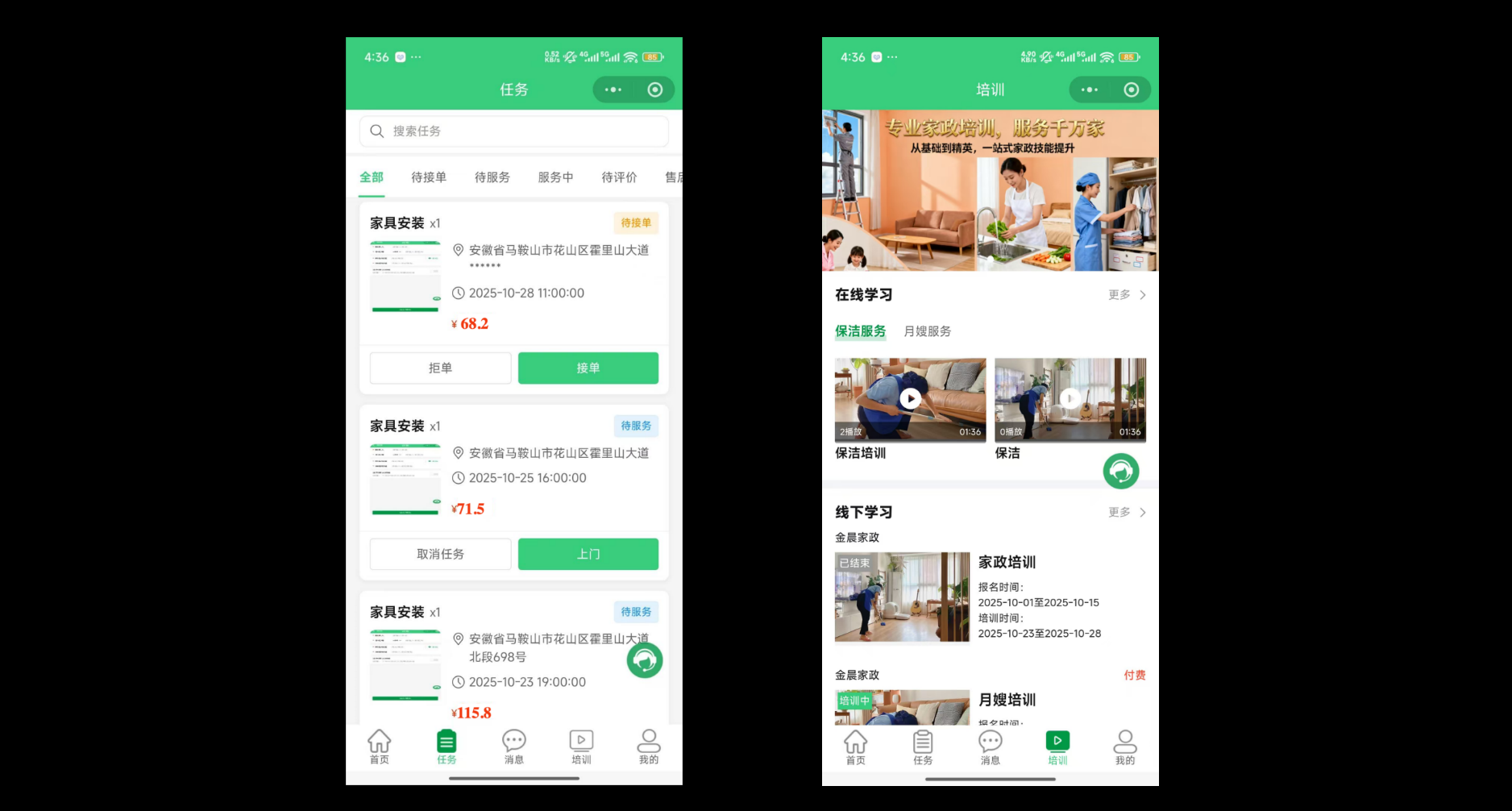 金晨家政扎根于安徽芜湖,是新兴的现代化家政服务品牌。公司旗下有着规模庞大的家政从业人员。针对客户在员工制管理、灵活就业人员标准化及培训就业闭环等方面的核心痛点,我们通过构建一体化信息管理平台,系统性地整合了182名正式员工与3000余名灵活就业人员的管理体系,打通了职业培训学校与家政服务业务的数据壁垒,实现了从技能培训、职业认证到服务调度、质量监控的全流程数字化覆盖,显著提升了人力资源配置效率与服务标准化水平,助力客户在快速扩张中保持服务质量与运营效率的双重优势。